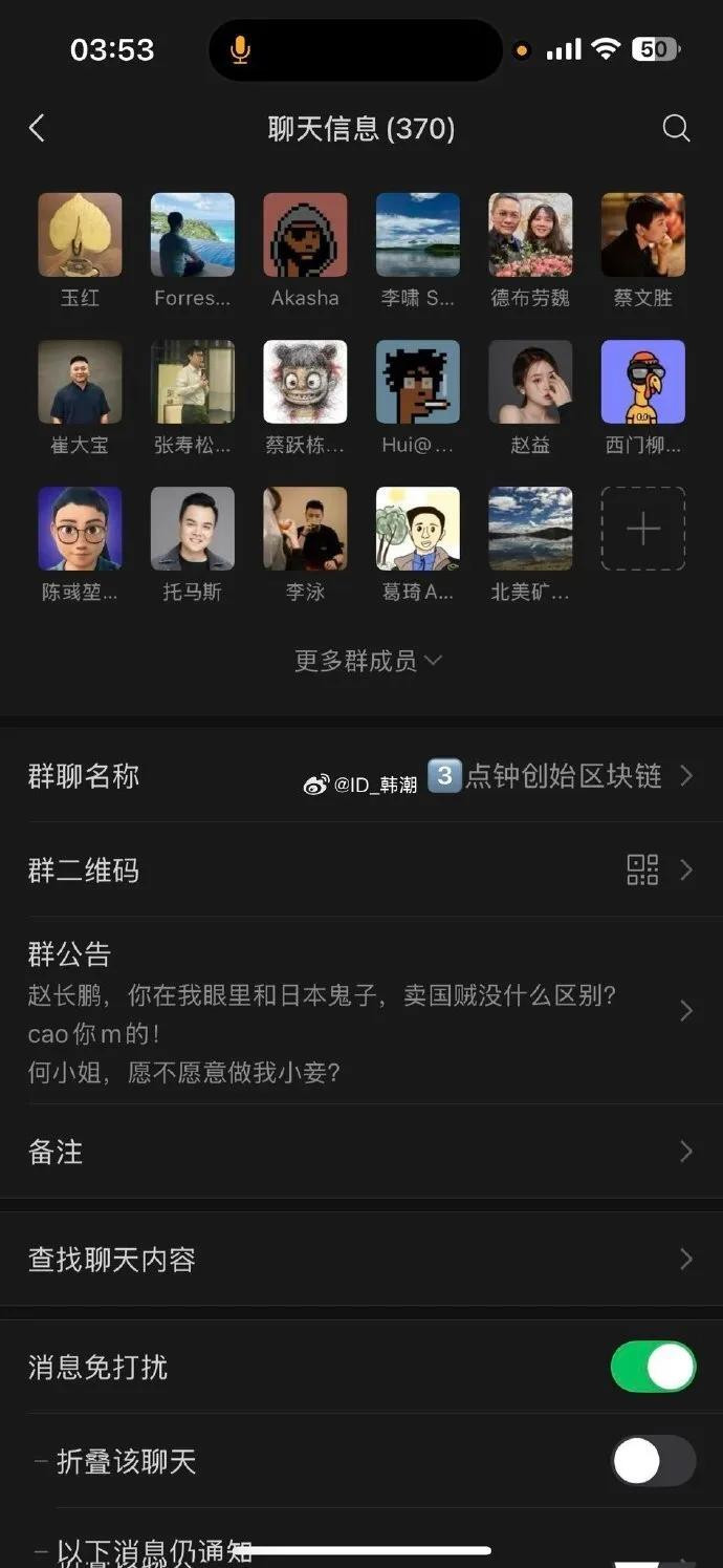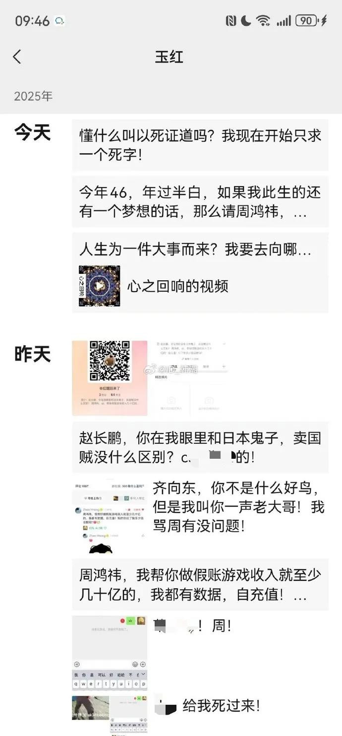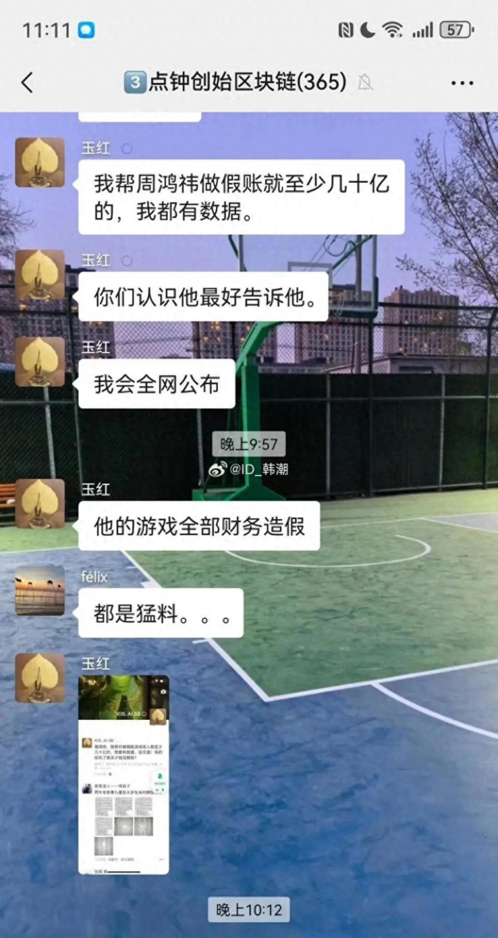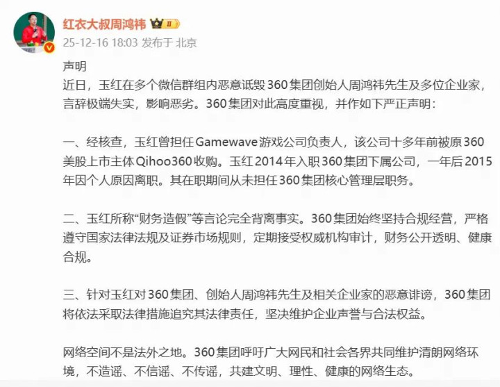 2025年12月16日,微博账号“ID_韩潮”发文指出,360前高管玉红在朋友圈和多个群聊中对周鸿祎进行“攻击”,自称帮其做假账。