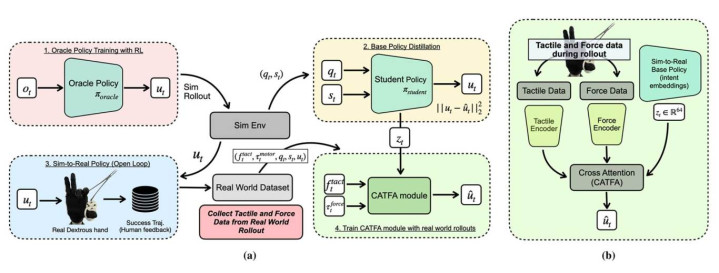 (a)研究工作流程概述。模拟培训和政策提炼;(b)通过CATFA模块在硬件上进行在线调整。