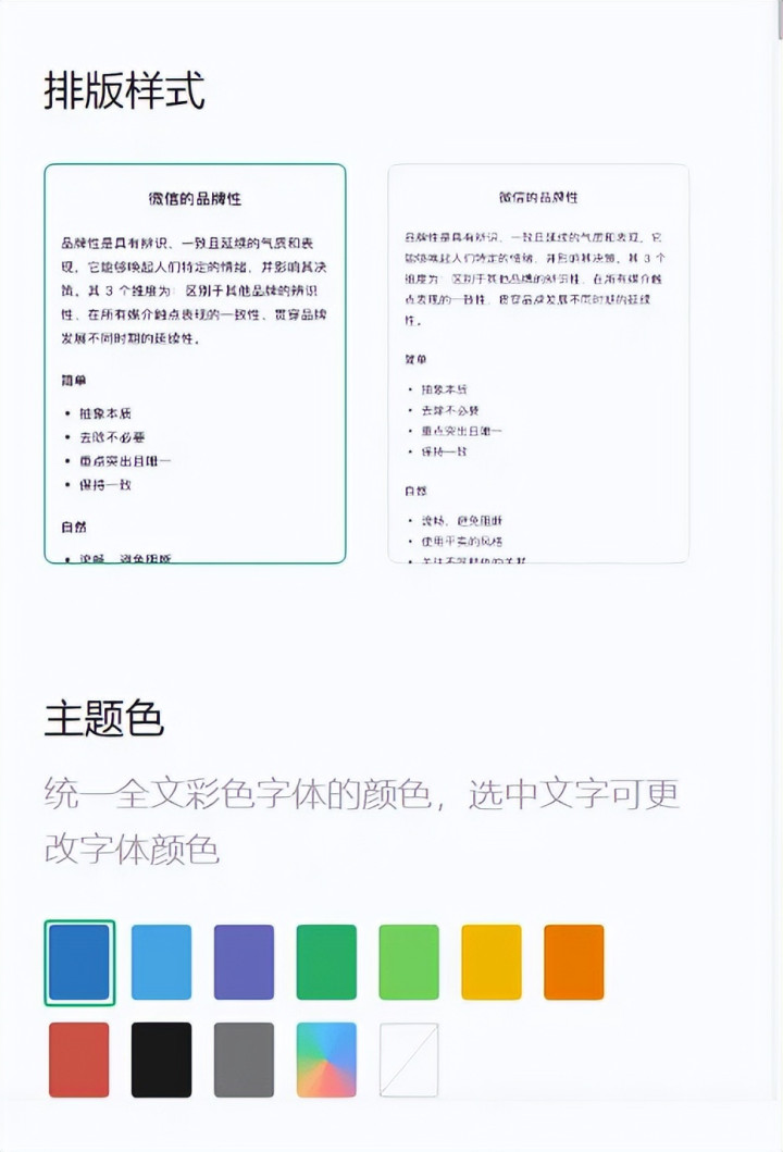 点击“一键排版”,会打开新的对话框,原来对话框不变。排版样式有两个可选,主题色有多个可选——选择排版样式整体美化布局,选中文字后可局部调整其字体粗细与颜色。