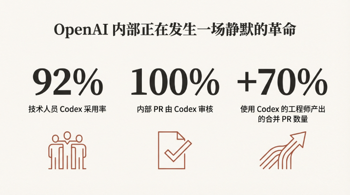 OpenAI内部技术人员的Codex采用率超过92%,所有内部PR都由Codex审核,使用Codex的工程师产出的合并PR比不用的多70%
