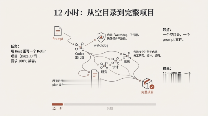 Codex做的第一件事不是写代码,是创建一个「watchdog」子代理——专门用来提醒主代理「你的目标是什么、用户的要求是什么」,防止跑偏