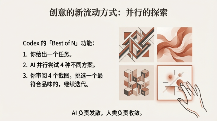 Codex有一个功能叫「BestofN」你给它一个任务,它可以并行尝试4种不同的方案,然后把4个结果的截图都给你看