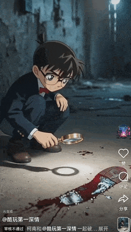 怎么样,是不是非常对味儿,并且配音都是系统自己加的,我提示词只有:柯南和@酷玩第一深情(我的AI分身)一起破案,他们俩在案发现场,开始勘察案发现场。