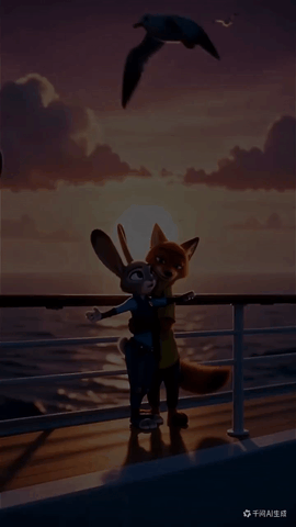 提示词:迪士尼/皮克斯照片级动画风格,狐狸尼克,兔子朱迪,站在日落时分的船头,模仿泰坦尼中最经典的姿势,温暖的粉紫色天空,背景有海鸥飞翔,海浪,细腻的毛发质感,生动的眼神表情
