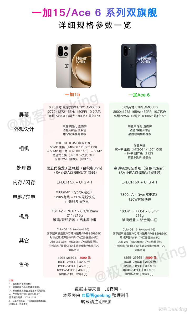 关于一加 15 这款高通第五代骁龙8 至尊版旗舰手机,此前和一加Ace 6 被同台发布于今年 10 月,这里附上两款旗舰手机的一张图配置完全总结图: