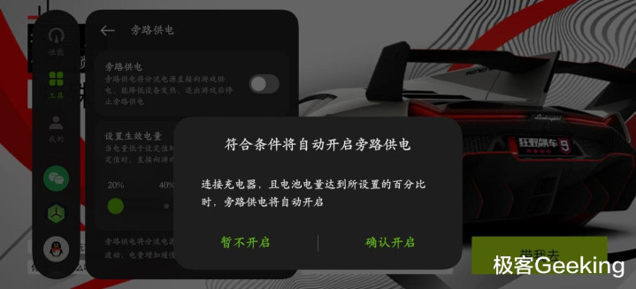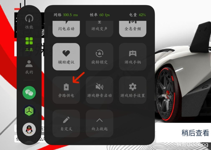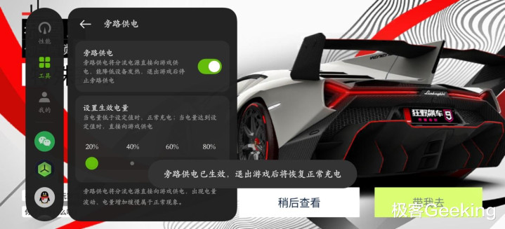 比如玩游戏时,打开屏幕侧边的游戏助手就能看到旁路供电功能选项。