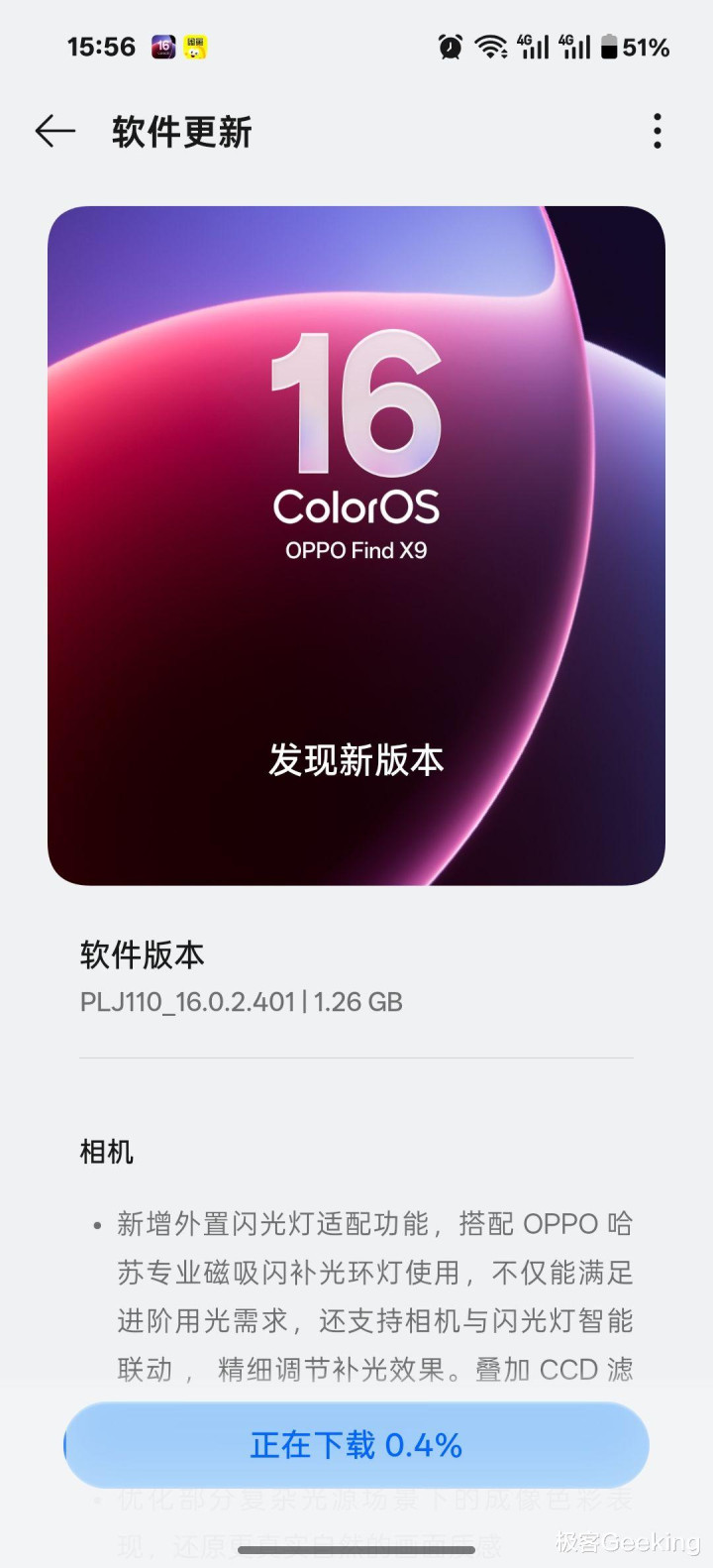 再如 OPPO Find X9,最近推送的最新版本也是 v401,OTA 升级包体积是 1.26GB,更新内容主要包括相机、出圈拼图、全场景旁路供电和通信互联等方面。
